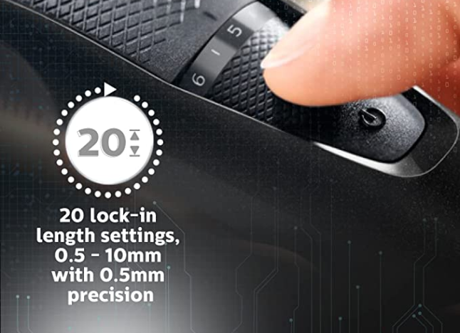 Trim your moustache or define details and edges in hard to reach areas with the click-on precision trimmer. Just spin the zoom wheel to one of 20 length settings between 0.5 and 10mm in 0.5mm increments for the exact length you're after.
